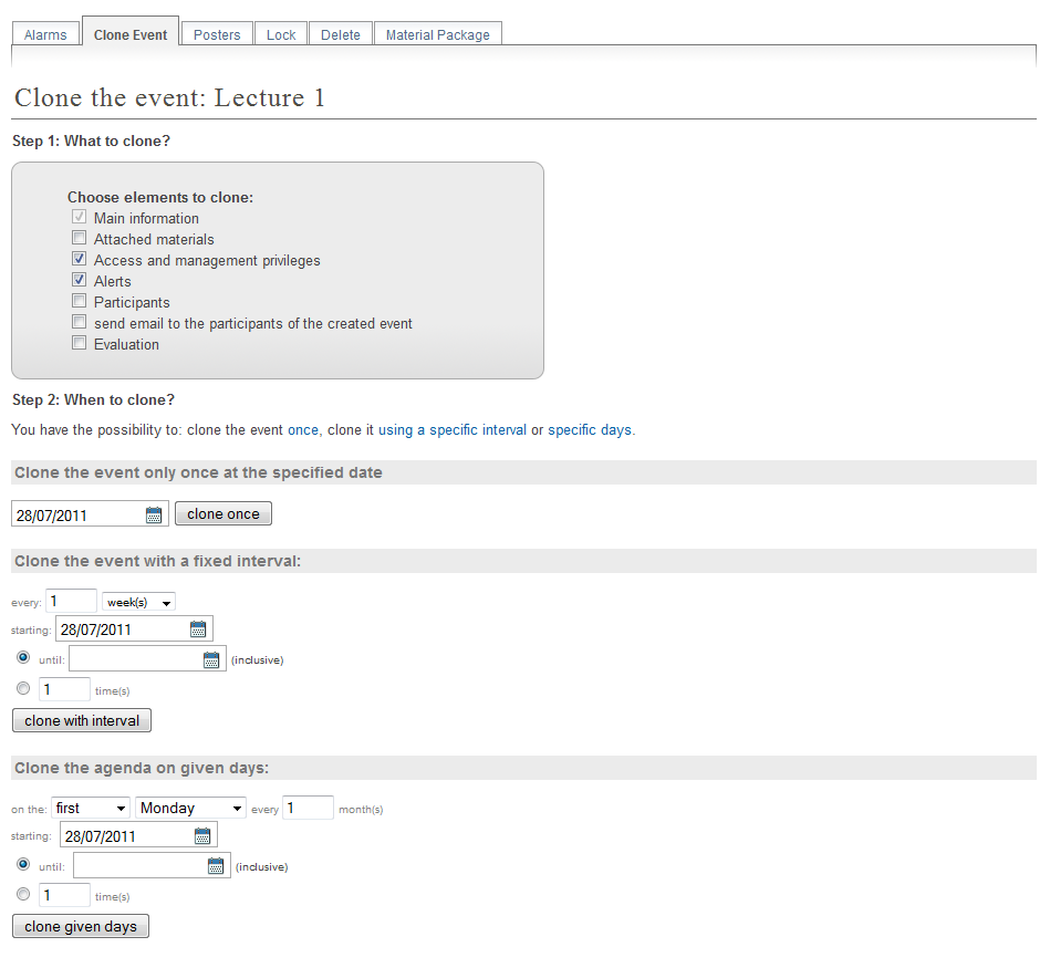 Clone the lecture if you would like to make another lecture exactly the same. You have the option to clone it once, at fixed intervals, or on certain dates.